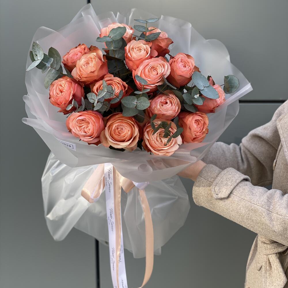 Эвкалипт – 2 шт. Оформление – 1 шт. роза сорта кахала – 15 шт.