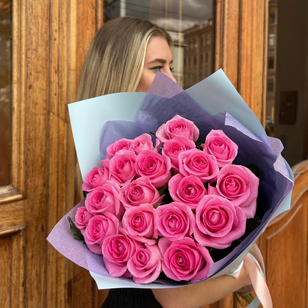 Роза малиновая 60 см – 21 шт.Дизайнерская упаковка – 3 шт.Тишью – 1 шт.Лента атласная – 1 шт.