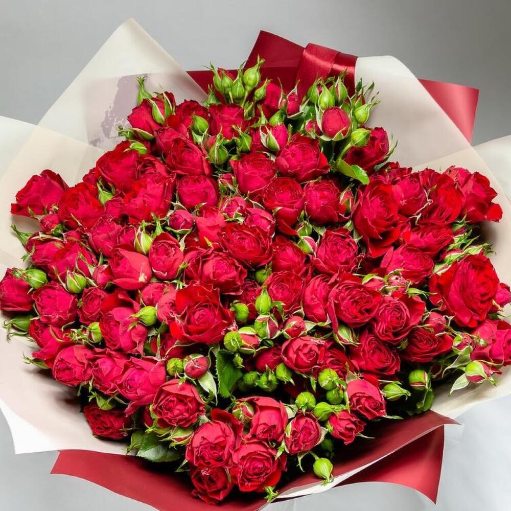 Роза кустовая – 29 шт.Упаковка дизайнерская – 2 шт.Лента атласная – 2 шт.Открыточка с вашими пожеланиями – 1 шт.хорошее настроение – 100 шт.инструкция по уходу за цветами – 1 шт.коробка переноска – 1 шт.Кризал – 1 шт.