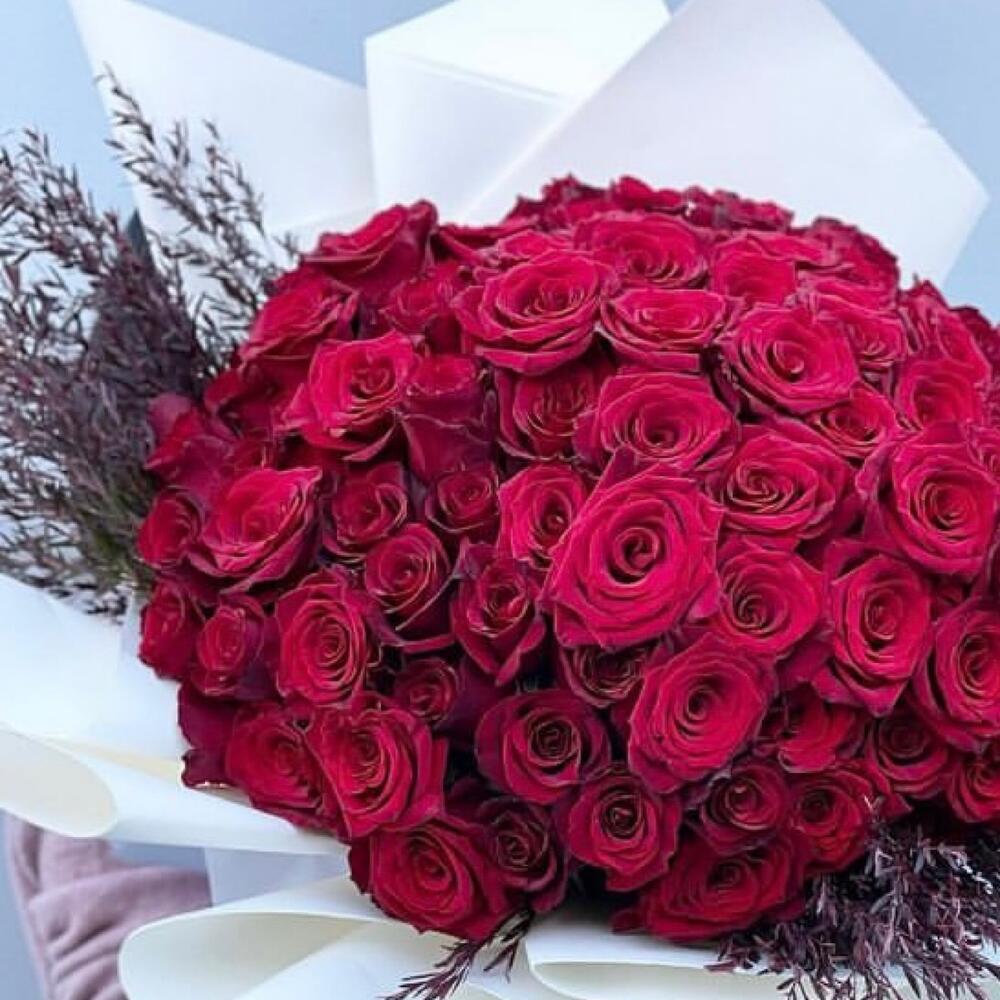 Алая роза – 51 шт.Упаковка дизайнерская – 1 шт.Лента атласная – 2 шт.Открытка – 1 шт.инструкция по уходу за цветами – 1 шт.хорошее настроение – 100 шт.коробка переноска – 1 шт.Кризал – 1 шт.Сухоцвет – 10 шт.
