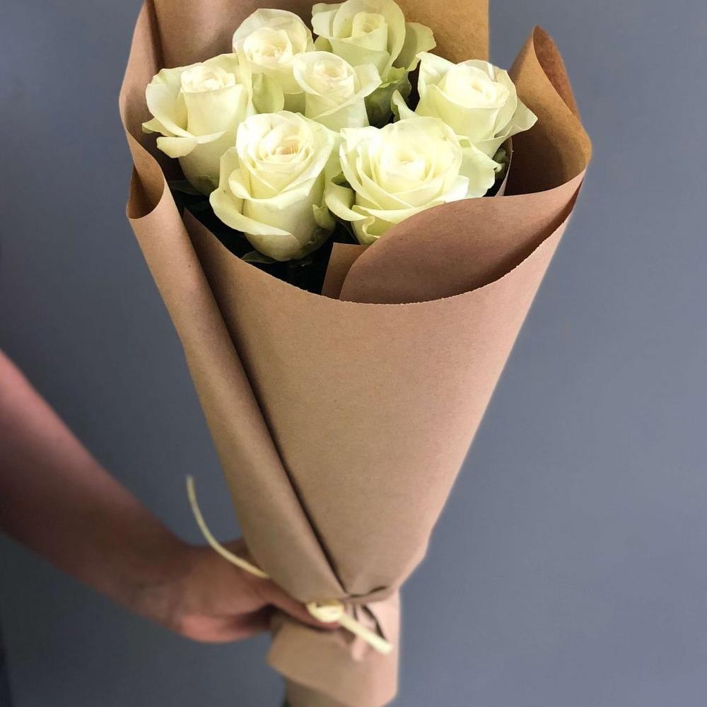 Роза – 7 шт.Дизайнерская упаковка – 1 шт.Лента атласная – 1 шт.