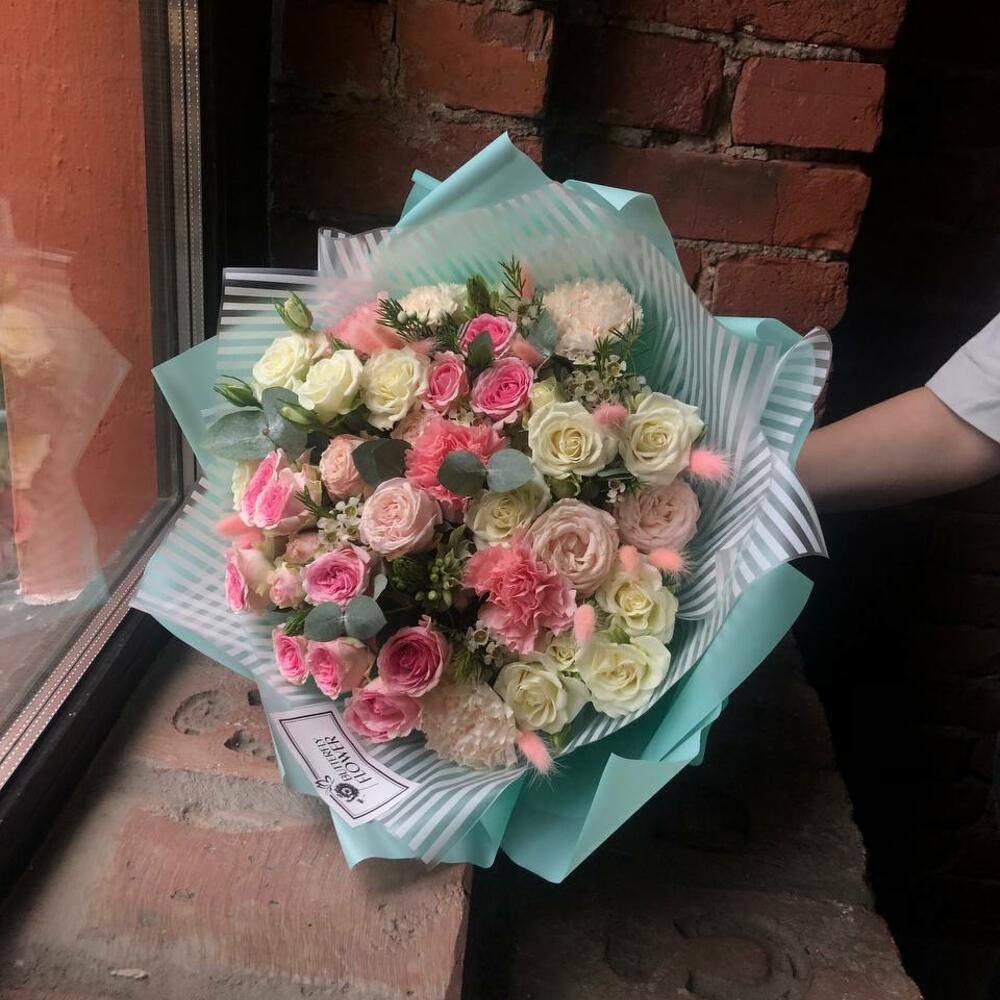 Букет из диантусов, ваксфлауэра, эвкалипта, кустовых роз, орнитогалума, лагуруса, эвкалипта и кустовых пионовидных роз “Савона”
