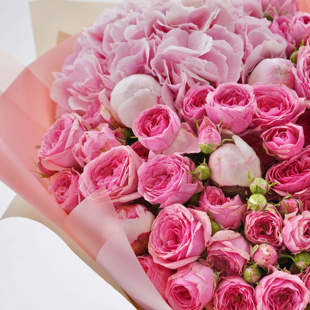 Пионовидная роза кустовая – 11 шт.пионы – 9 шт.гортензия розовая большая – 9 шт.Лента атласная – 2 шт.Упаковка дизайнерская – 2 шт.Кризал – 1 шт.инструкция по уходу за цветами – 1 шт.коробка переноска – 1 шт.