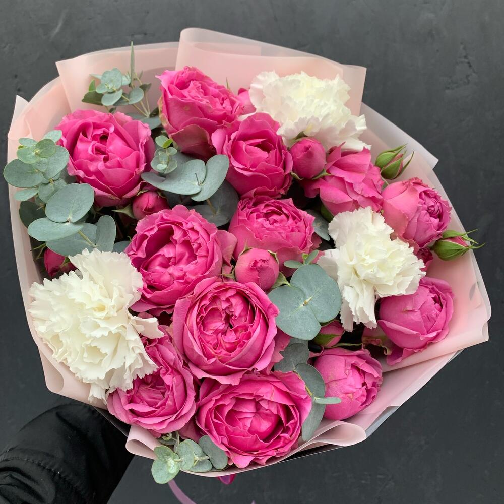 Букет из пионовидных роз,гвоздик и эвкалипта Кэнди