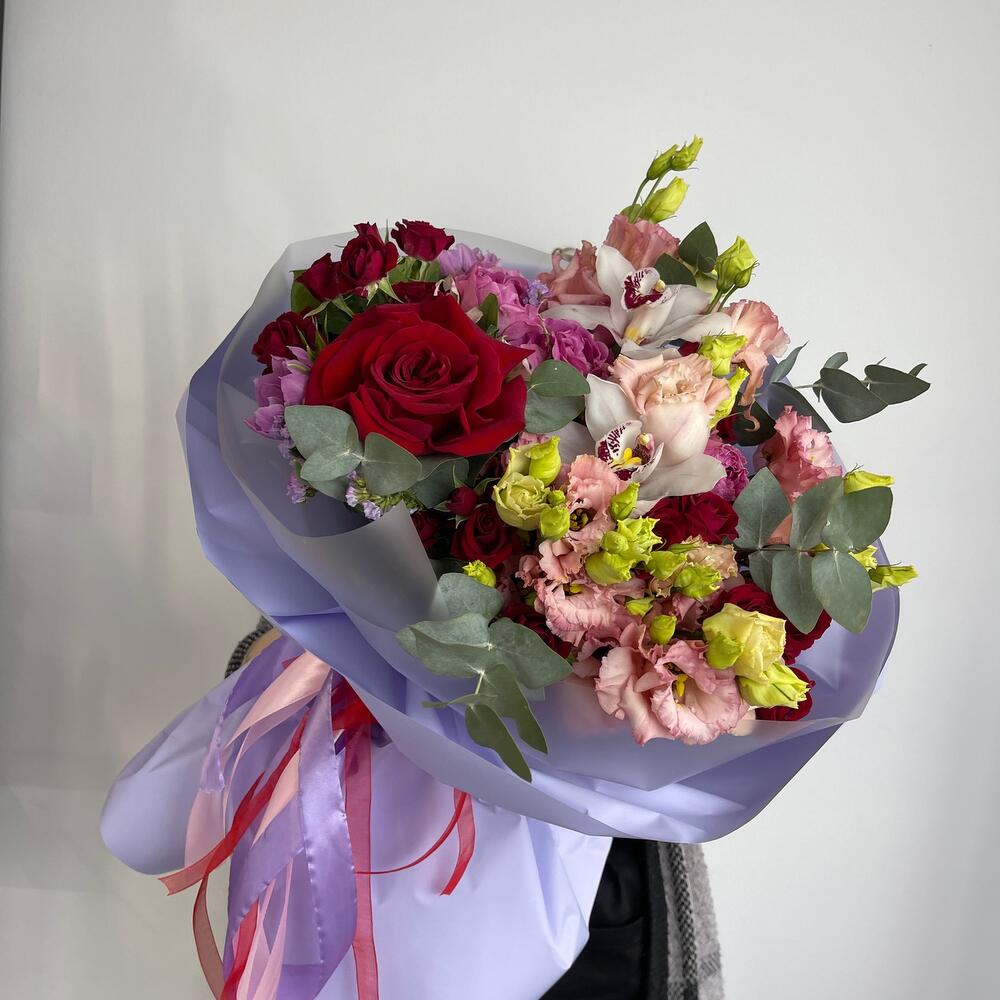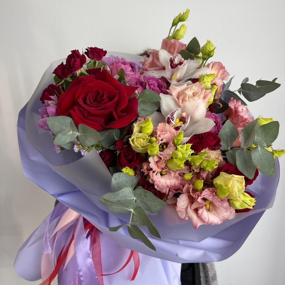 Кустовая роза – 4 шт.Бомбастик – 3 шт.Эустома – 4 шт.Тюльпан – 3 шт.Альстромерия – 2 шт.орхидея – 2 шт.Роза – 1 шт.Эвкалипт – 4 шт.Статица – 1 шт.Салал пучок – 1 шт.Пленка матовая – 4 шт.Лента атласная – 2 шт.