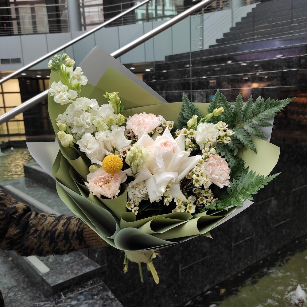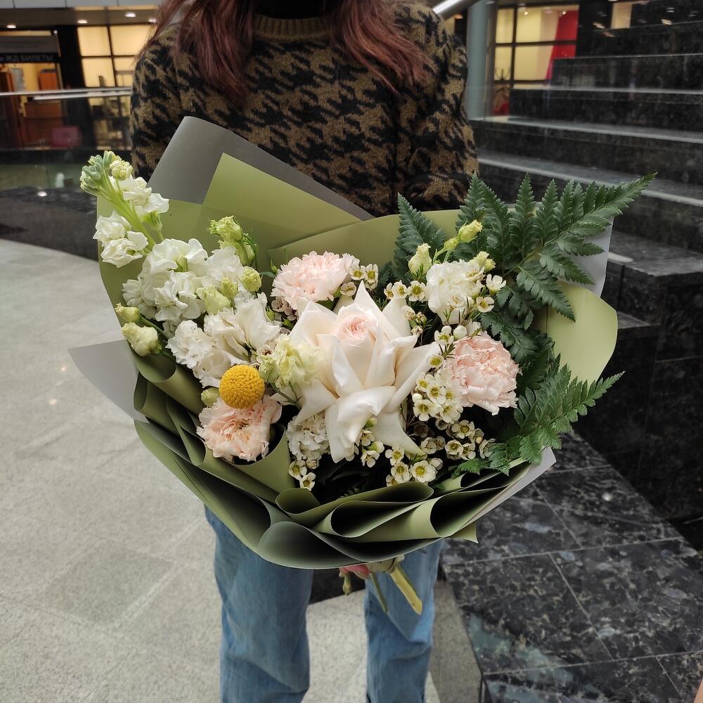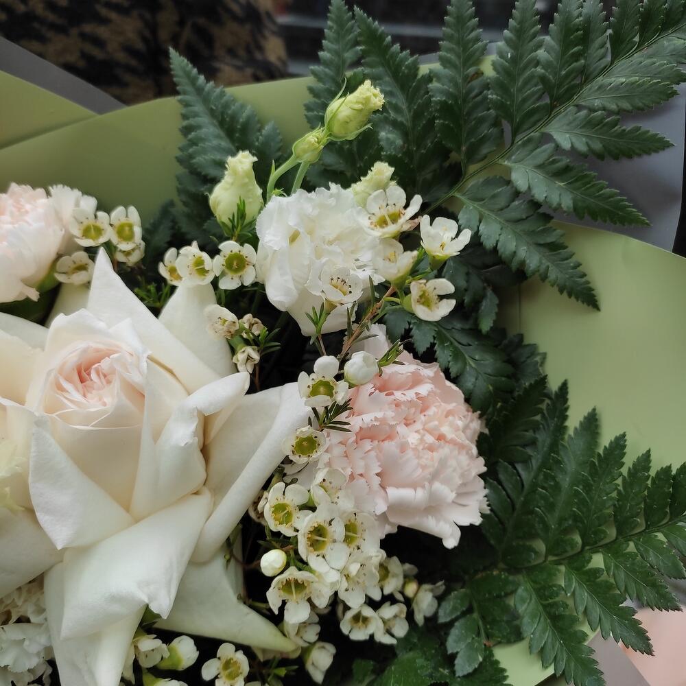 Роза – 1 шт.Лизиантус – 2 шт.Ваксфлауэр – 2 шт.Маттиола – 1 шт.Диантус – 3 шт.Папоротник – 2 шт.Лента – 2 шт.Упаковка дизайнерская – 2 шт.