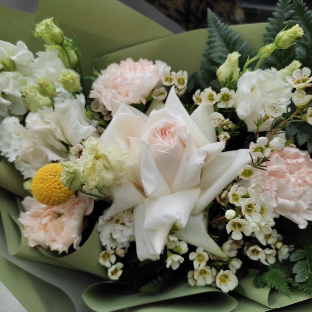 Букет из розы, белой маттиолы и диантуса