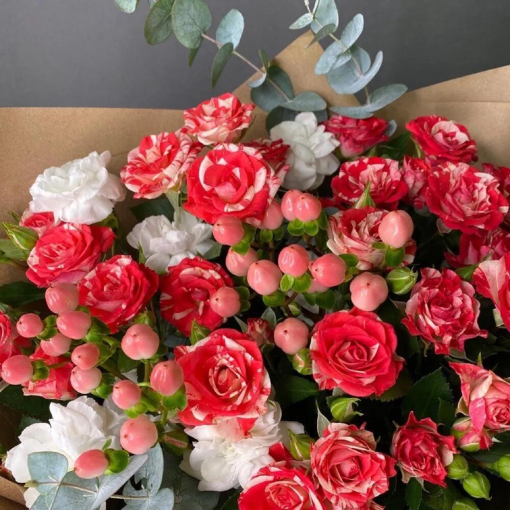 Роза кустовая – 5 шт.Эвкалипт – 3 шт.Лента атласная – 1 шт.Диантус – 4 шт.Крафт упаковка – 2 шт.гиперикум ягоды розывые – 2 шт.