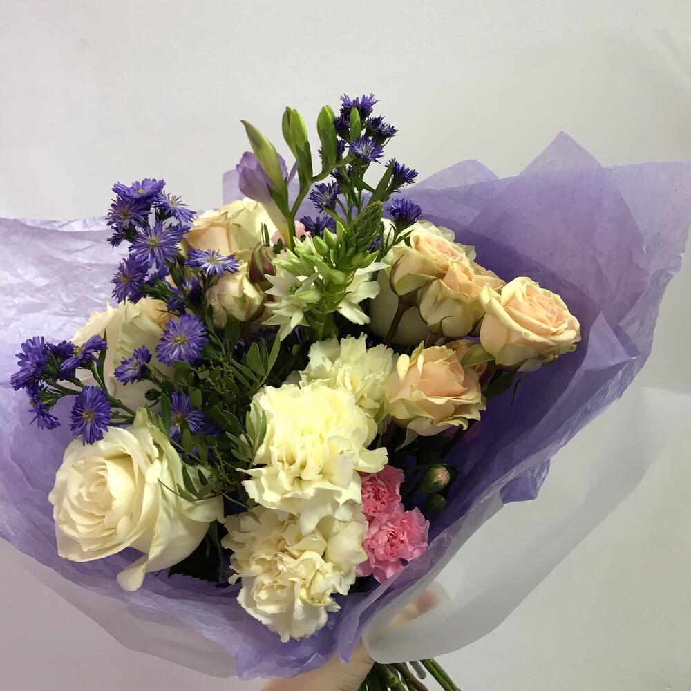 Роза Мондиаль – 4 шт.Гвоздика – 5 шт.Астра – 3 шт.Орнитогалум – 1 шт.Фрезия – 1 шт.Роза кустовая – 2 шт.Фисташка – 1 шт.Упаковка дизайнерская – 1 шт.Лента атласная – 1 шт.открытка с вашими пожеланиями – 1 шт.