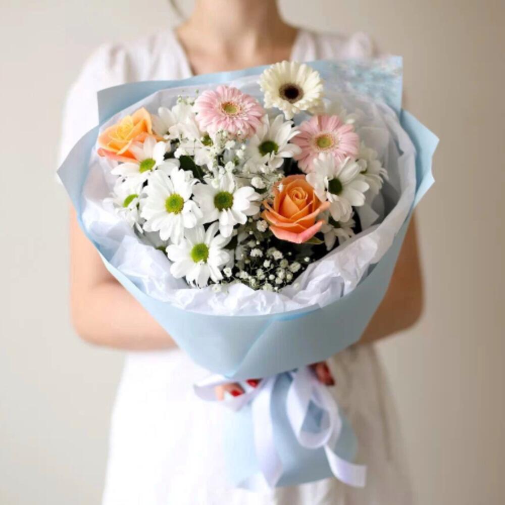 Гербера мини – 3 шт.Гипсофила – 1 шт.Роза эквадор 50 см – 2 шт.Хризантема кустовая – 2 шт.