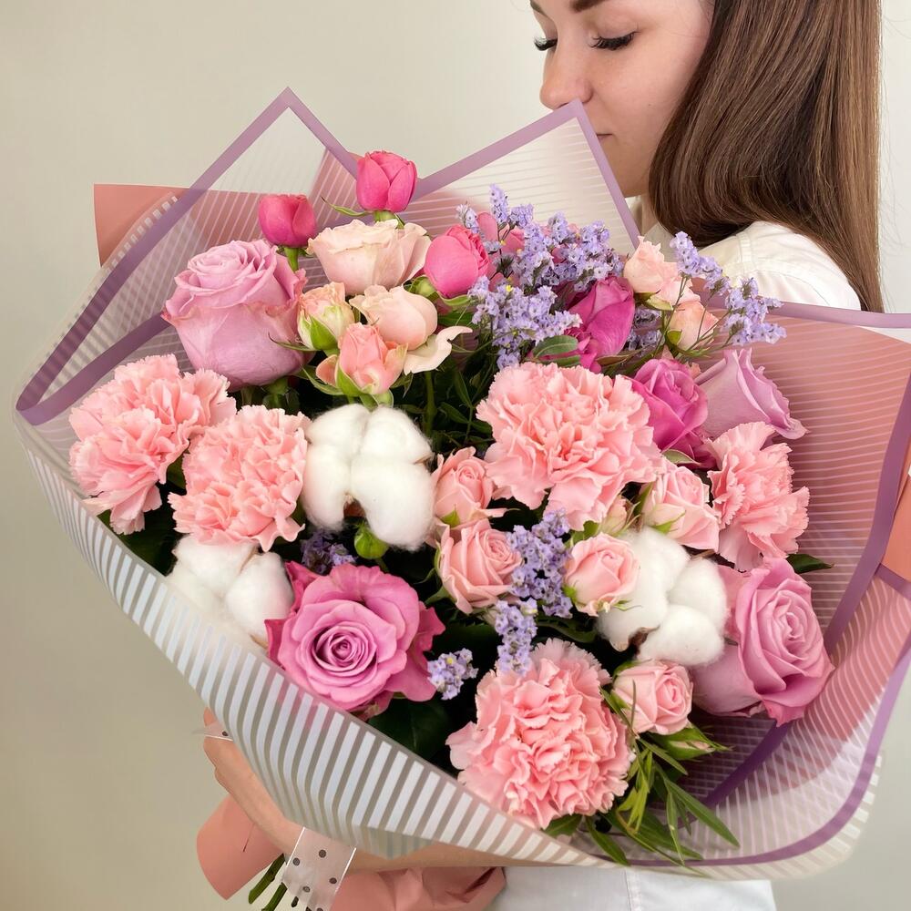 Лимониум – 2 шт.Роза – 5 шт.Кустовая роза – 5 шт.Диантус – 5 шт.Фисташка – 3 шт.Упаковка дизайнерская – 2 шт.Хлопок натуральный – 3 шт.