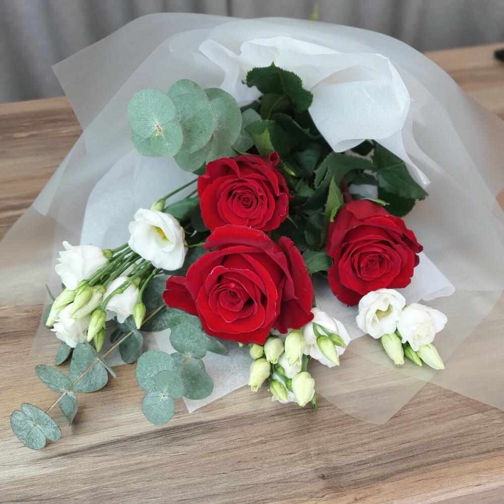 Букет с красными розами , эустомой и эвкалиптом