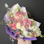 Гипсофила – 2 шт.Гортензия – 1 шт.Лизиантус – 2 шт.Маттиола – 3 шт.Озотамнус – 1 шт.Эвкалипт – 3 шт.Роза – 3 шт.Диантус – 2 шт.Фисташка – 5 шт.ЦИМБИДИУМ – 3 шт.Упаковка дизайнерская – 4 шт.