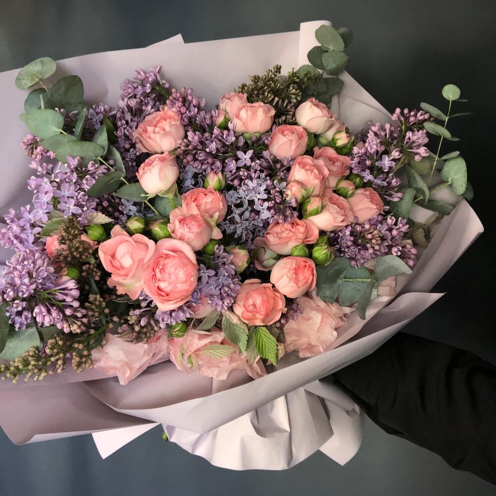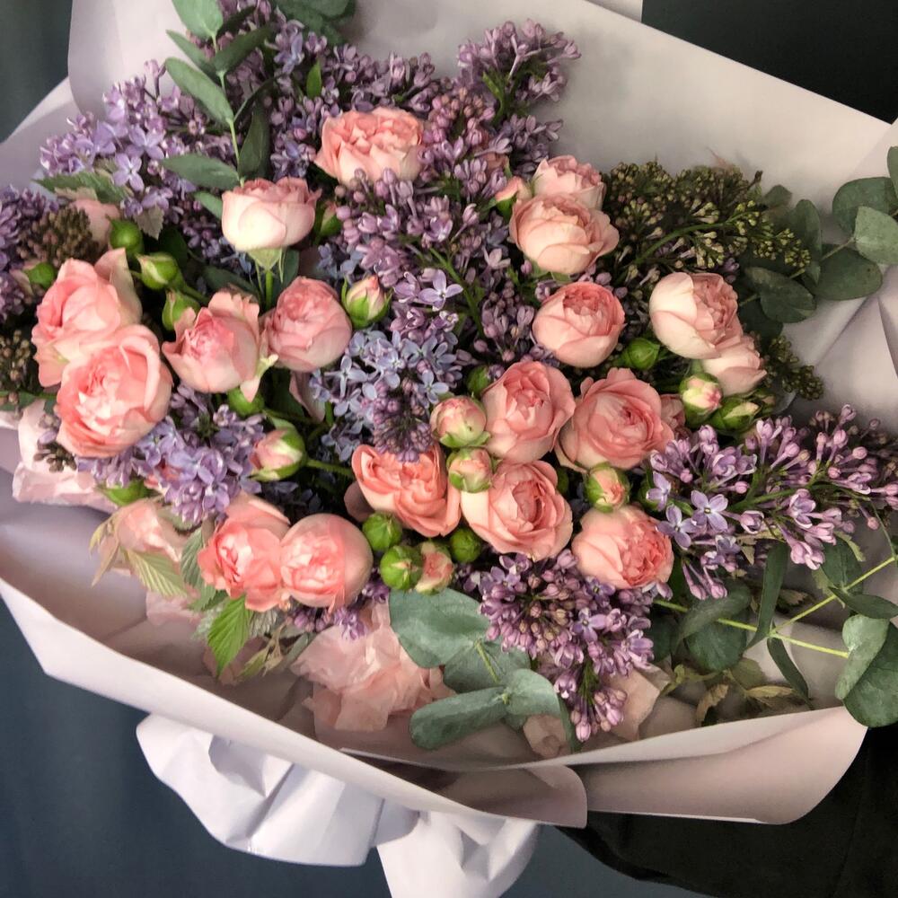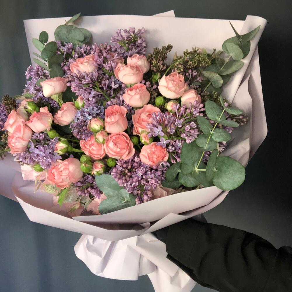 сирень пучок – 4 шт.Роза кустовая пионовидная – 5 шт.Упаковка дизайнерская – 2 шт.Эвкалипт – 3 шт.