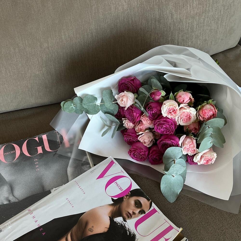 Эвкалипт – 5 шт.Кустовая пионовидная роза – 5 шт.Фирменная упаковка – 1 шт.