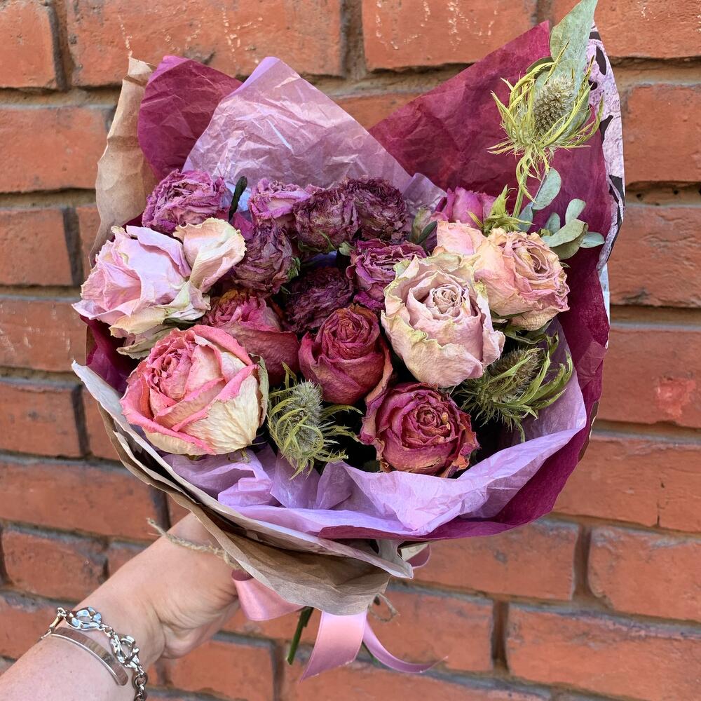 Роза пионовидная кустовая – 2 шт.Роза пионовидная – 11 шт.Эрингиум – 1 шт.Эвкалипт – 1 шт.Упаковка дизайнерская – 1 шт.