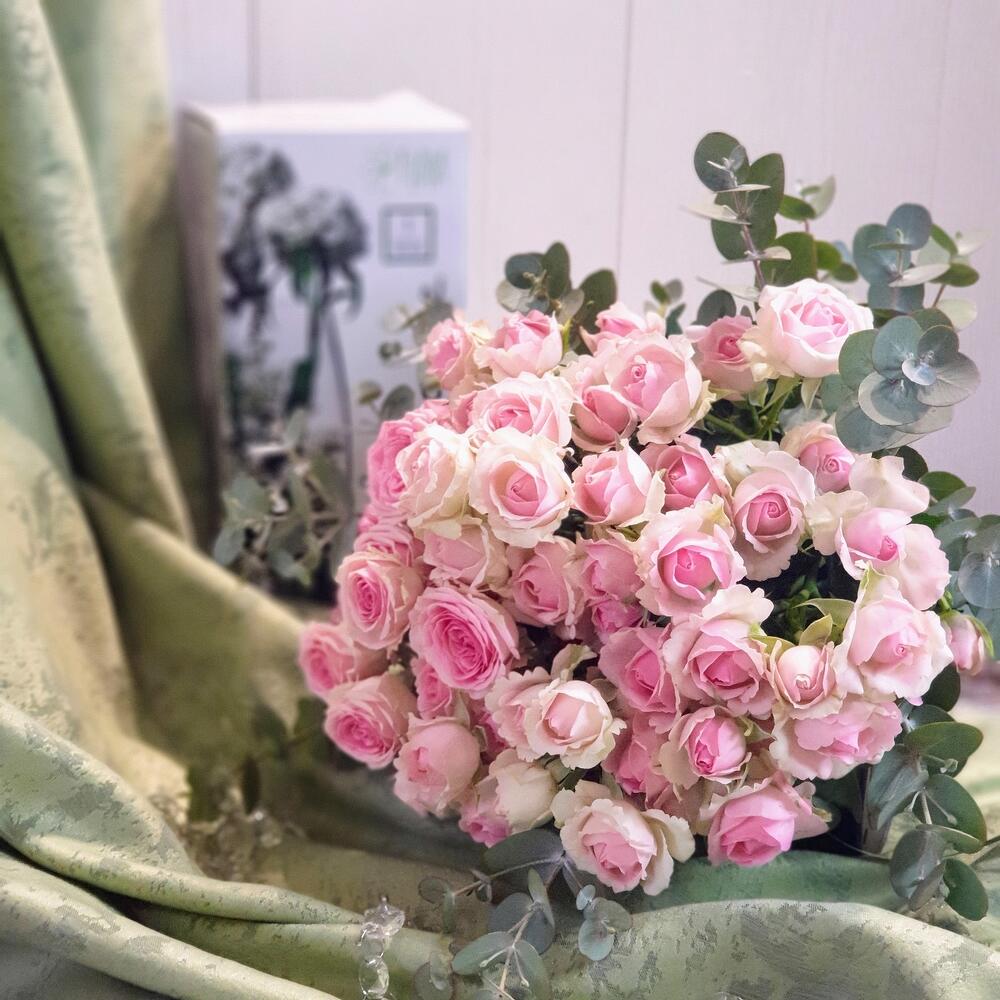 Эвкалипт – 5 шт.Лента атласная – 1 шт.Роза кустовая пионовидная – 7 шт.Пакет подарочный – 1 шт.Кризал (подкормка) – 2 шт.Ваза стеклянная – 1 шт.