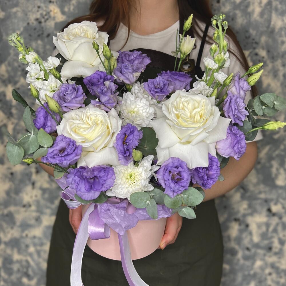 роза пионовидная плайя бланка – 3 шт.Хризантема кустовая – 1 шт.эустома лавандовая – 3 шт.Маттиола – 2 шт.Эвкалипт – 3 шт.Оазис флористический – 1 шт.Тишью белое – 1 шт.Коробка шляпная – 1 шт.Лента атласная – 2 шт.