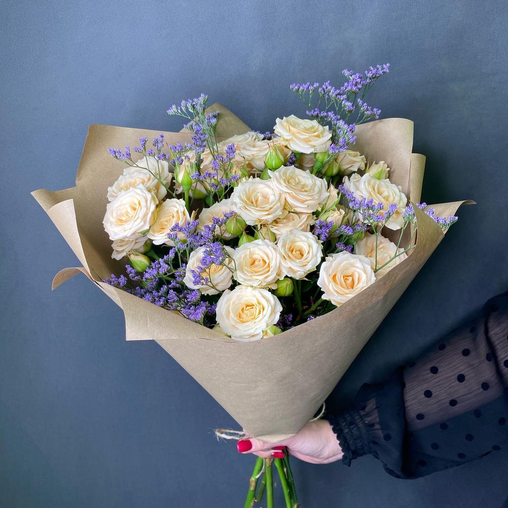 Роза кустовая – 5 шт.Джут – 1 шт.Крафт упаковка – 3 шт.Лимониум сиреневый – 2 шт.