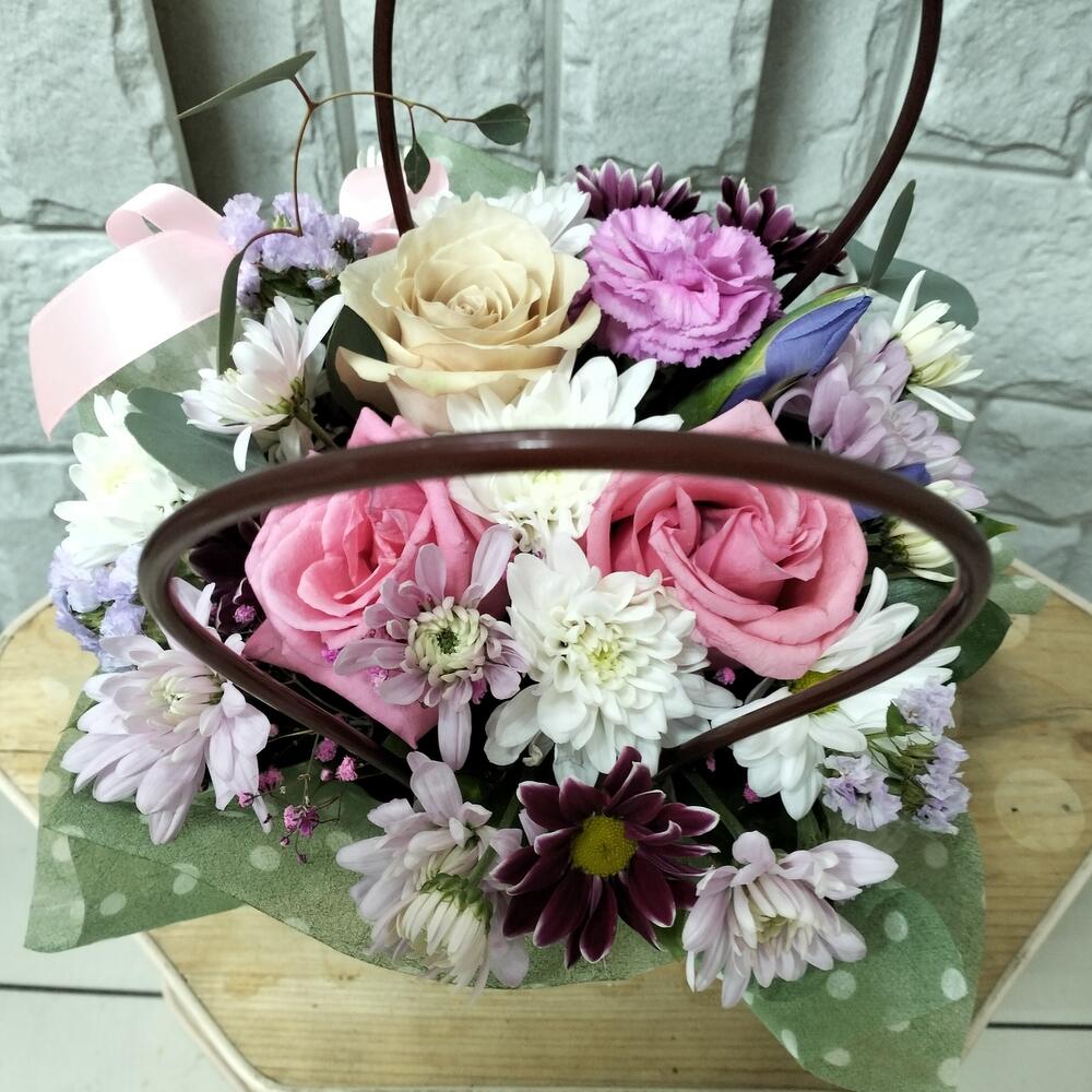 Хризантема кустовая – 2 шт.Роза – 3 шт.Лента атласная – 1 шт.Гвоздика сортовая – 1 шт.Ирис Blue Magic – 2 шт.Статица сиреневая – 1 шт.Сумочка картонная – 1 шт.Упаковка фетр – 1 шт.