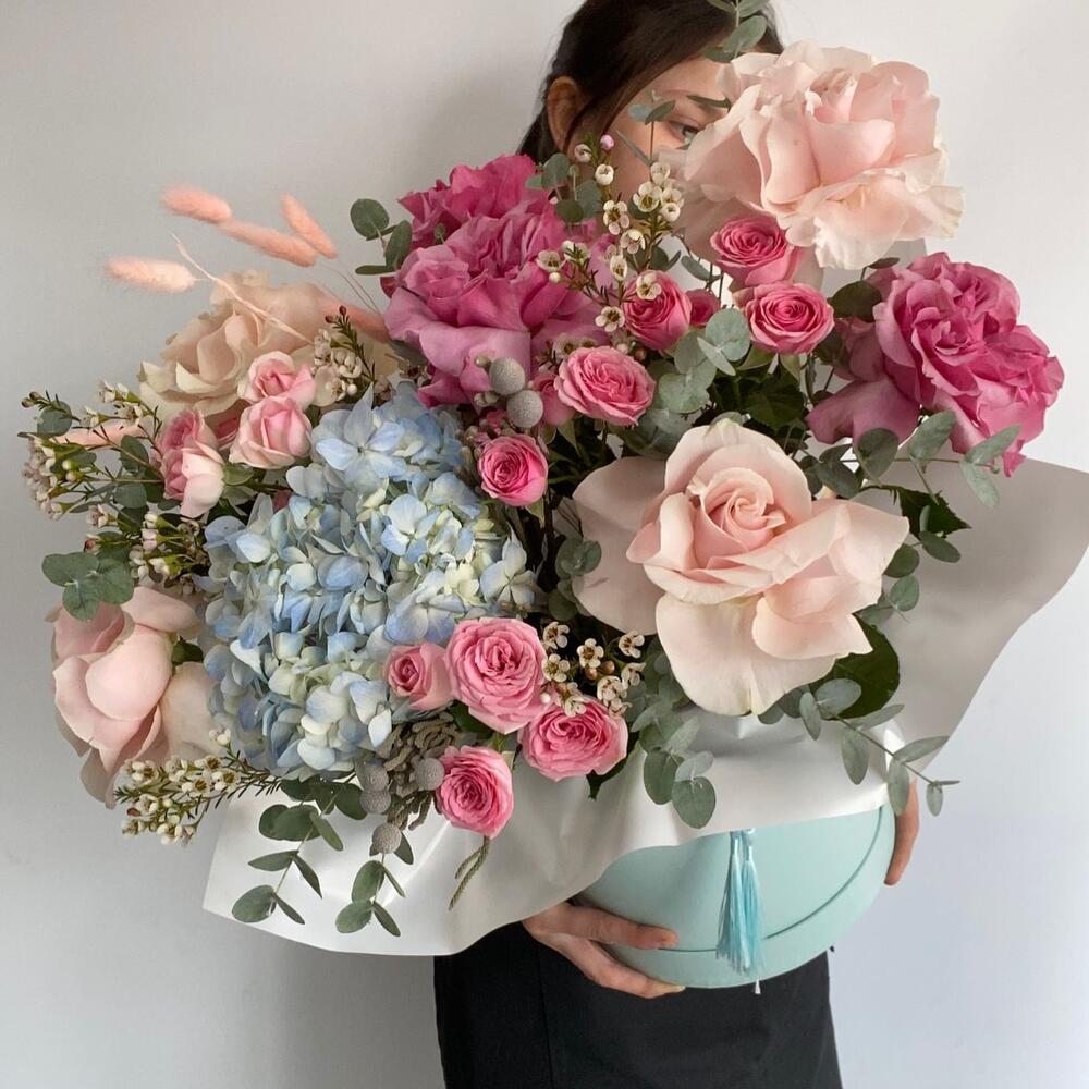 Альстромерии, Кустовые розы, Лизиантусы, Пионовидные розы, Розы, Ромашки