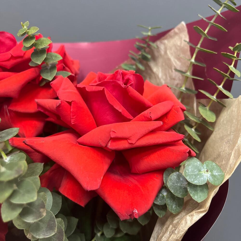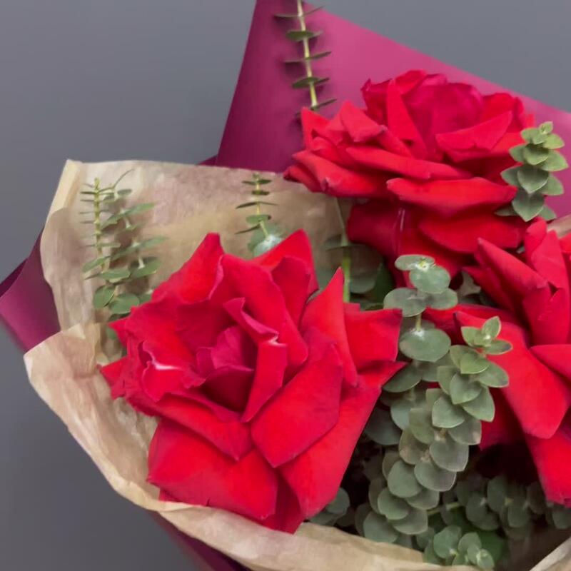 Лента атласная – 1 шт.Тишью – 1 шт.Эвкалипт Baby Blue – 3 шт.Упаковка корейская пленка – 1 шт.роза французская алая нина – 3 шт.