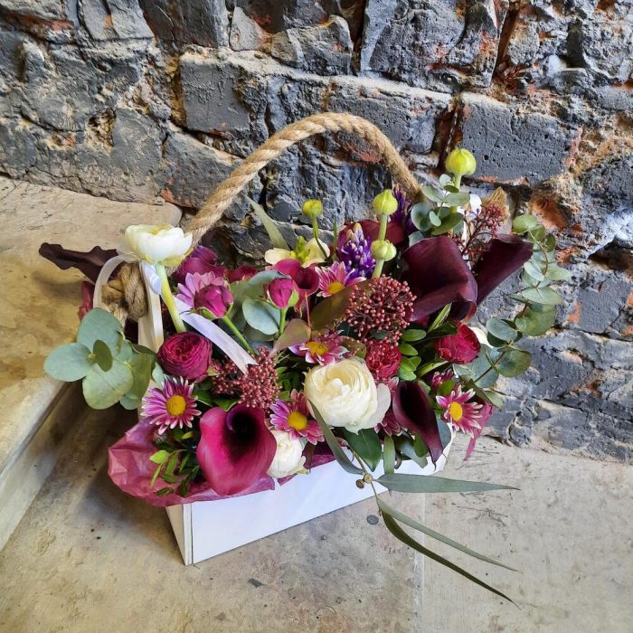 Ящик деревянный – 1 шт.Оазис флористический – 1 шт.Калла – 11 шт.Пион – 1 шт.Гиацинт – 1 шт.Гвоздика – 1 шт.Роза пионовидная кустовая – 1 шт.Скиммия – 1 шт.Антуриум – 1 шт.Эвкалипт – 1 шт.