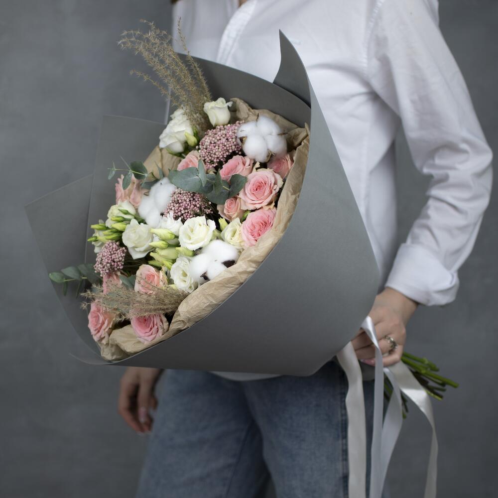 Озотамнус – 3 шт.Хлопок – 3 шт.Лизиантус – 3 шт.Кустовая роза – 3 шт.Эвкалипт – 5 шт.эулалия – 2 шт.Упаковка – 2 шт.