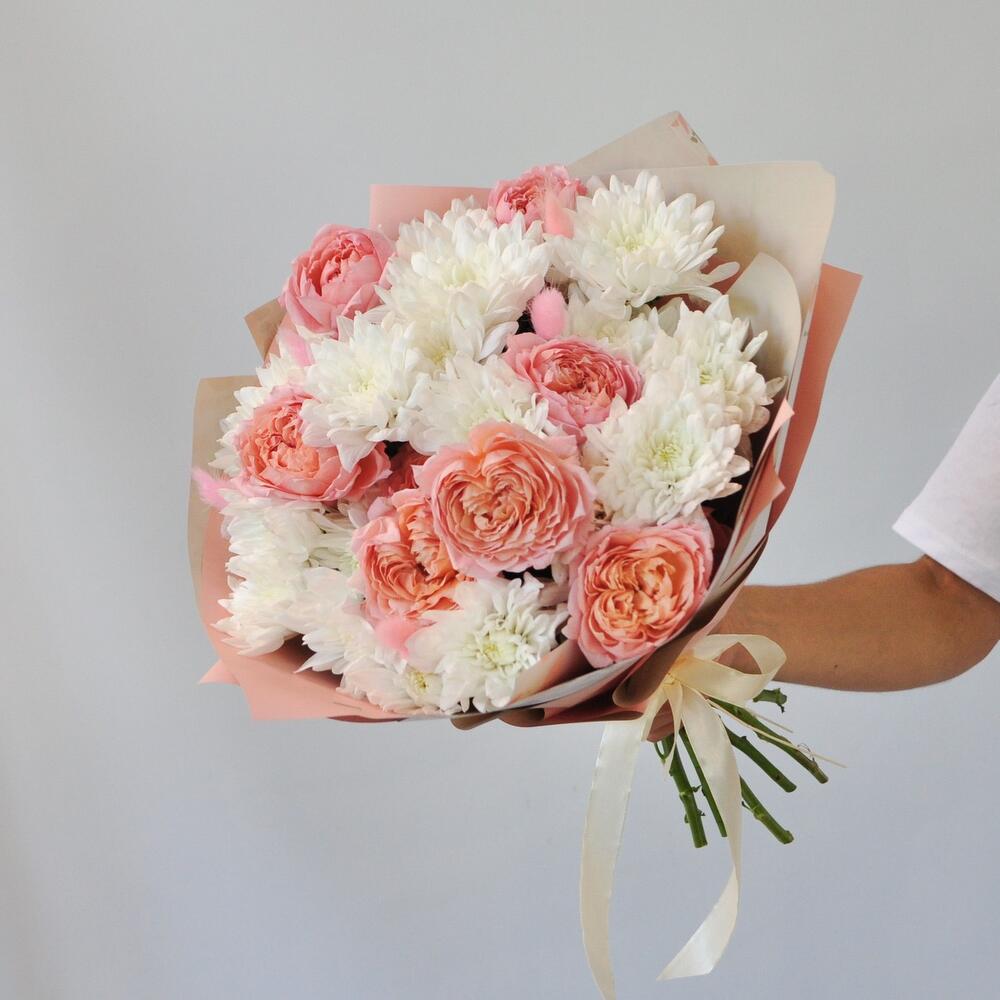 Хризантема кустовая – 5 шт.Роза пионовидная кустовая – 5 шт.Лагурус – 5 шт.Упаковка дизайнерская – 2 шт.Лента атласная – 1 шт.