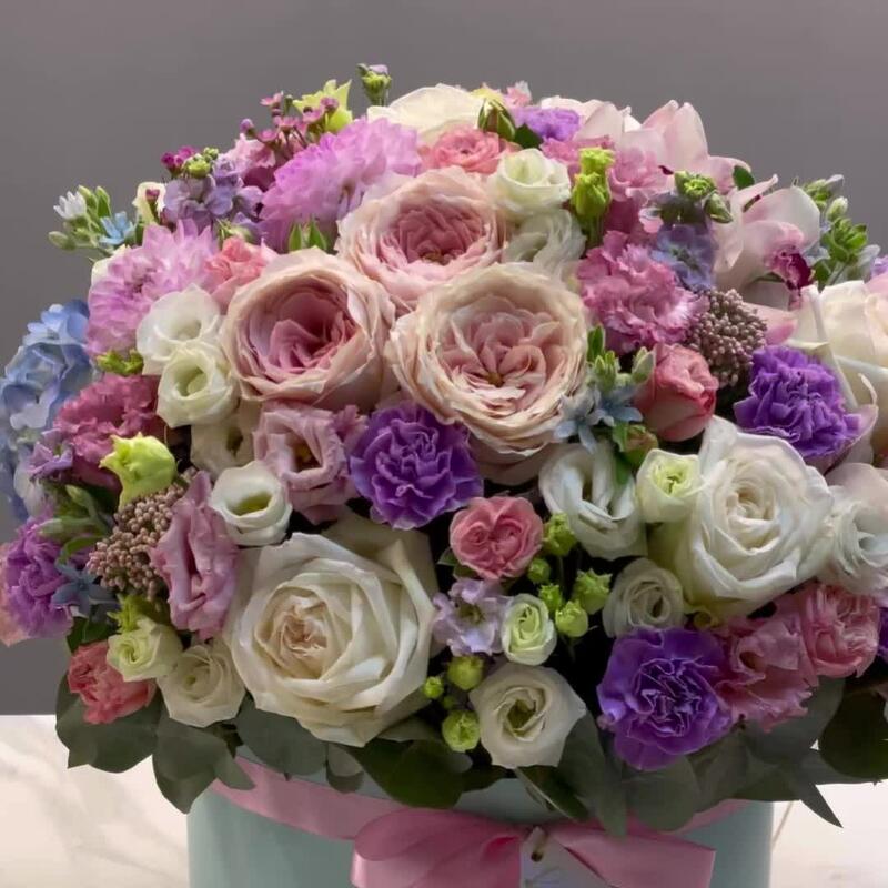 Ваксфлауэр – 3 шт.Гортензия – 2 шт.Маттиола – 5 шт.Озотамнус – 5 шт.Эвкалипт – 3 шт.Эустома – 7 шт.Лента атласная – 1 шт.гвоздика moon – 7 шт.Шляпная коробка – 1 шт.орхидея – 5 шт.Роза кустовая пионовидная – 5 шт.Оксипеталум – 11 шт.Лизиантус махровый – 5 шт.Оазис флористический – 4 шт.роза вайт о хара( ароматная) – 7 шт.роза цумуги пионовидная – 7 шт.