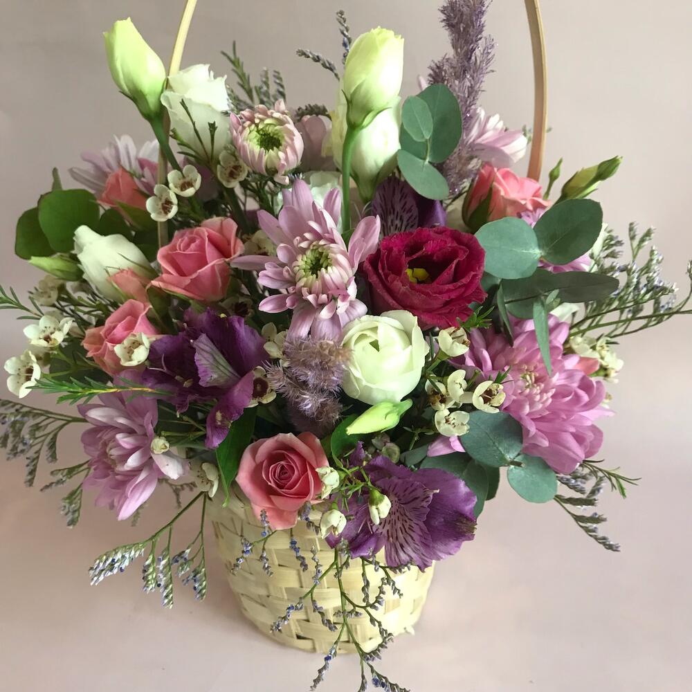 Альстромерия – 1 шт.Ваксфлауэр – 3 шт.Лизиантус – 3 шт.Лимониум – 3 шт.Роза кустовая – 1 шт.Хризантема кустовая – 2 шт.Эвкалипт – 2 шт.Корзина плетеная – 1 шт.декор трава – 2 шт.