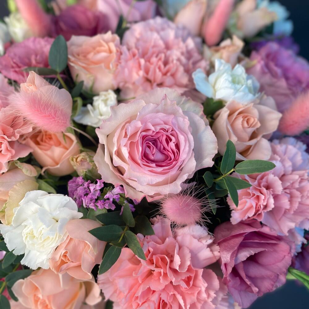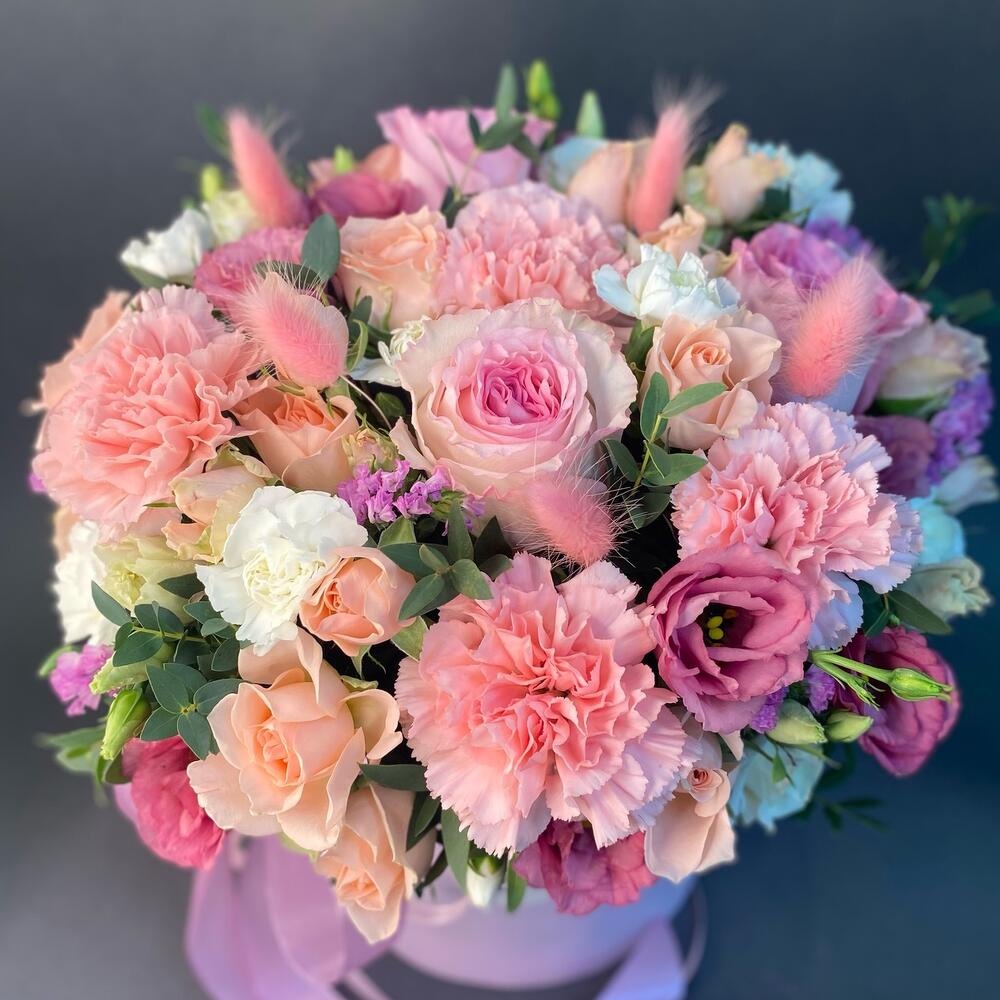 Роза Эквадор – 3 шт.Роза кустовая – 2 шт.ларгус розовый – 5 шт.Лизиантус – 3 шт.Диантус – 4 шт.дианиус кустовой – 3 шт.Эвкалипт Микс – 1 шт.Фисташка – 5 шт.шляпная коробка с губкой – 1 шт.