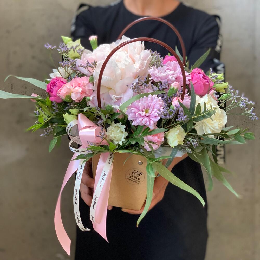 Крафт – 1 шт.Пион – 1 шт.Хризантема кустовая – 1 шт.Роза кустовая – 2 шт.Гвоздика – 3 шт.Гвоздика кустовая – 1 шт.Эустома – 1 шт.Лимониум – 1 шт.зелень декоративная – 1 шт.