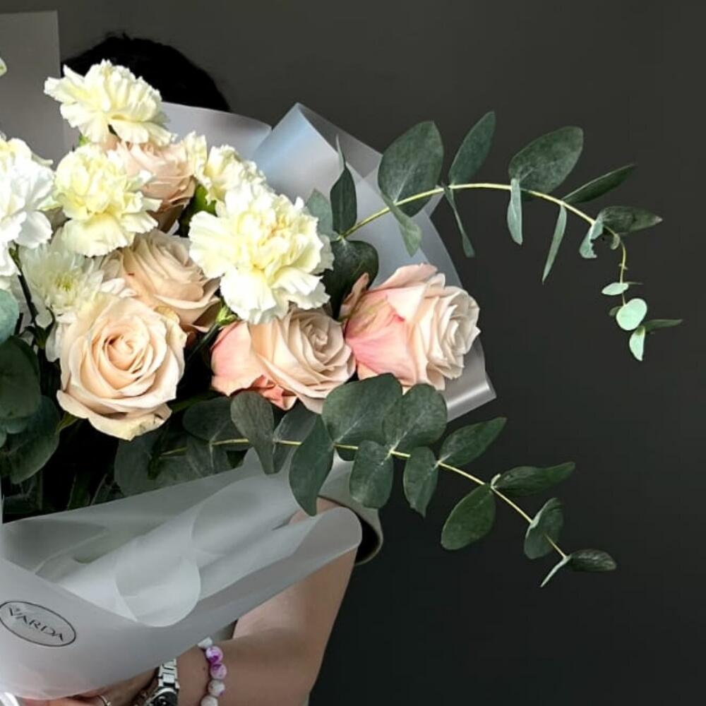 Альстромерии, Кустовые розы, Лизиантусы, Пионовидные розы, Розы, Ромашки