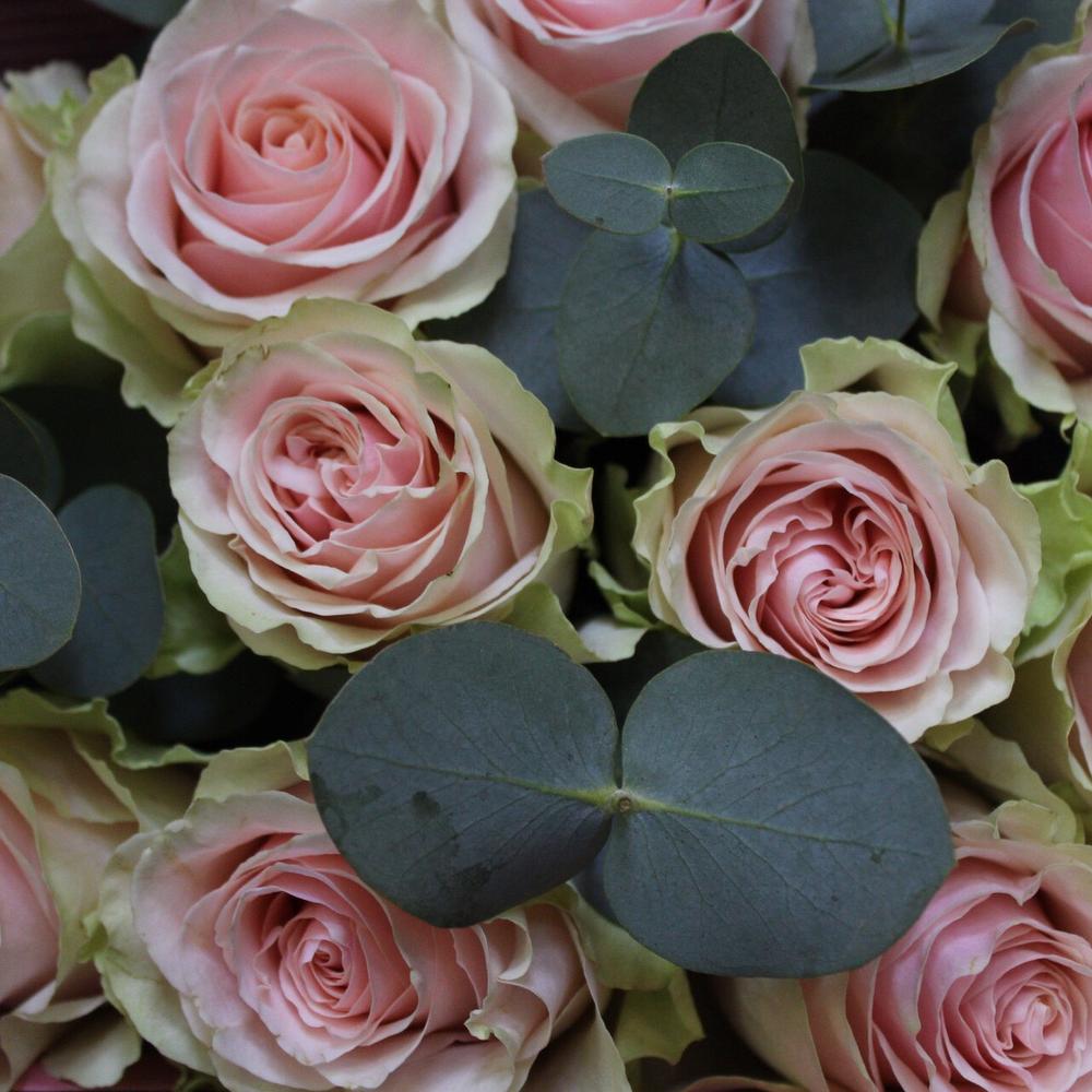 роза фрутетто – 11 шт.Эвкалипт – 3 шт.Пленка дизайнерская – 3 шт.Лента атласная – 2 шт.
