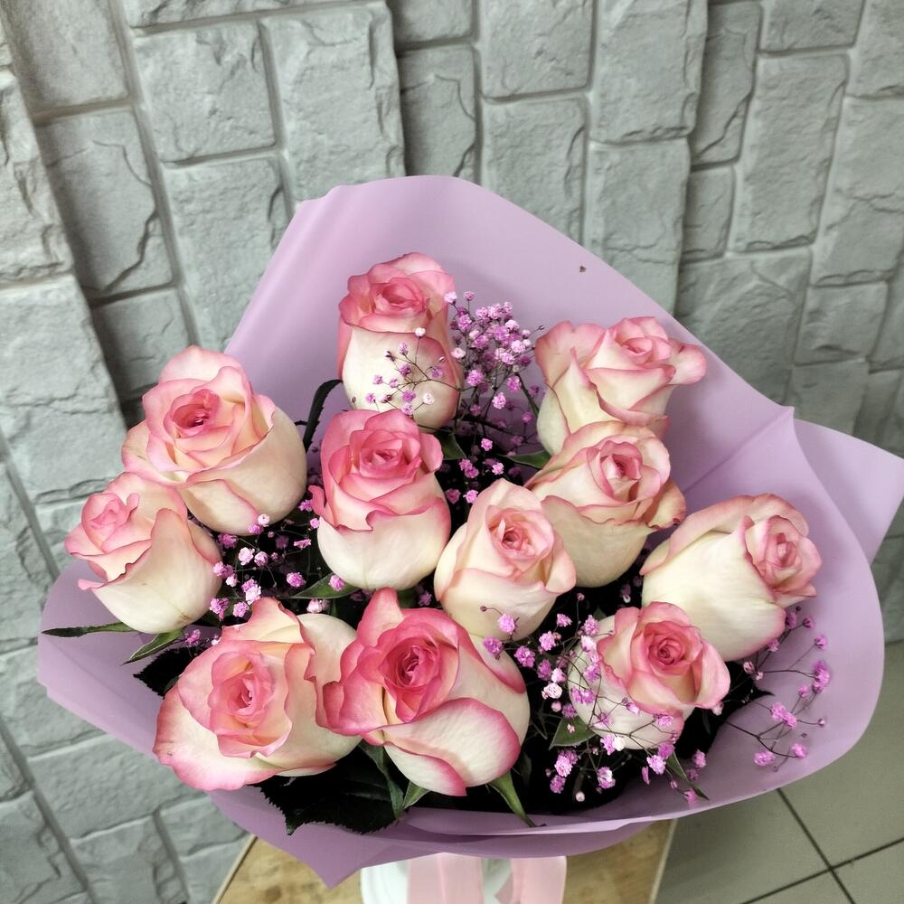 Роза Эквадор – 11 шт.Лента атласная – 1 шт.Упаковка дизайнерская – 2 шт.Гипсофила розовая – 2 шт.