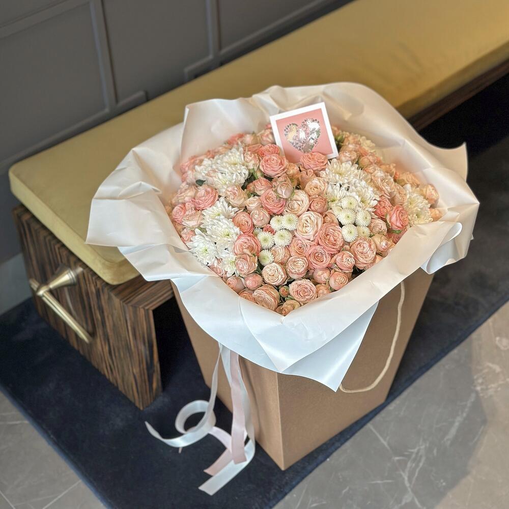 Альстромерии, Кустовые розы, Лизиантусы, Пионовидные розы, Розы, Ромашки