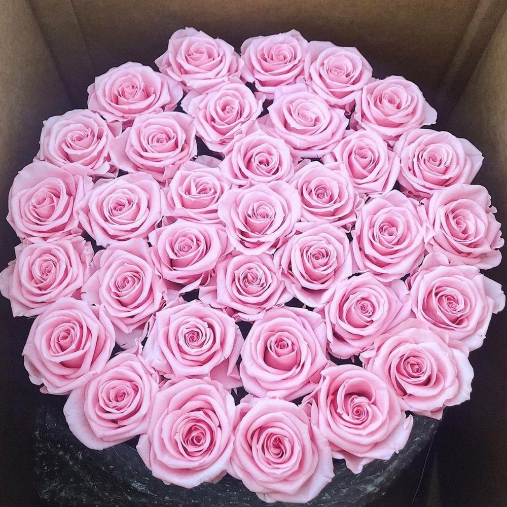 Роза розовая – 35 шт.Коробка шляпная – 1 шт.Лента атласная розовая – 1 шт.кирпич флористический – 3 шт.