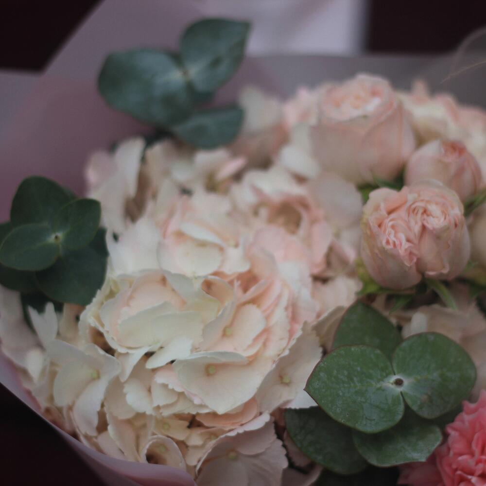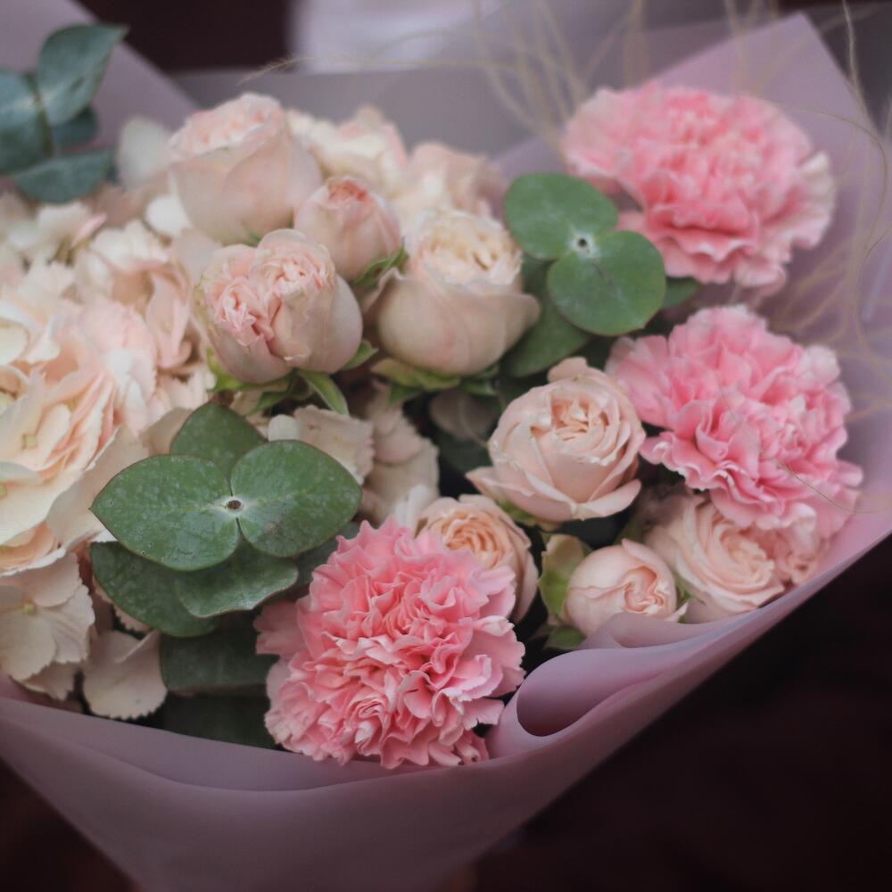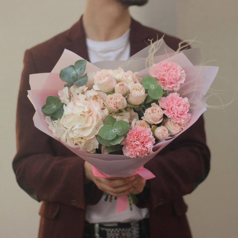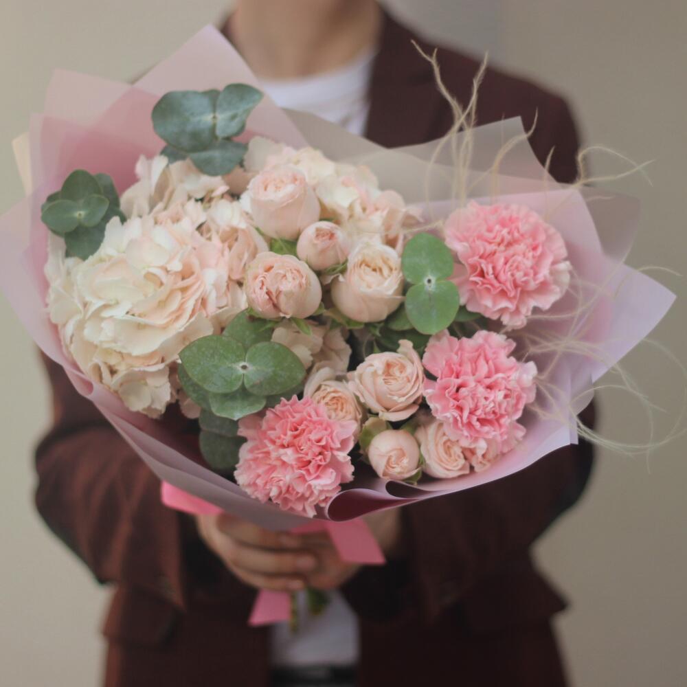 Нежный авторский букет с гортензией, пионовидными кустовыми розами Бомбастик и гвоздиками