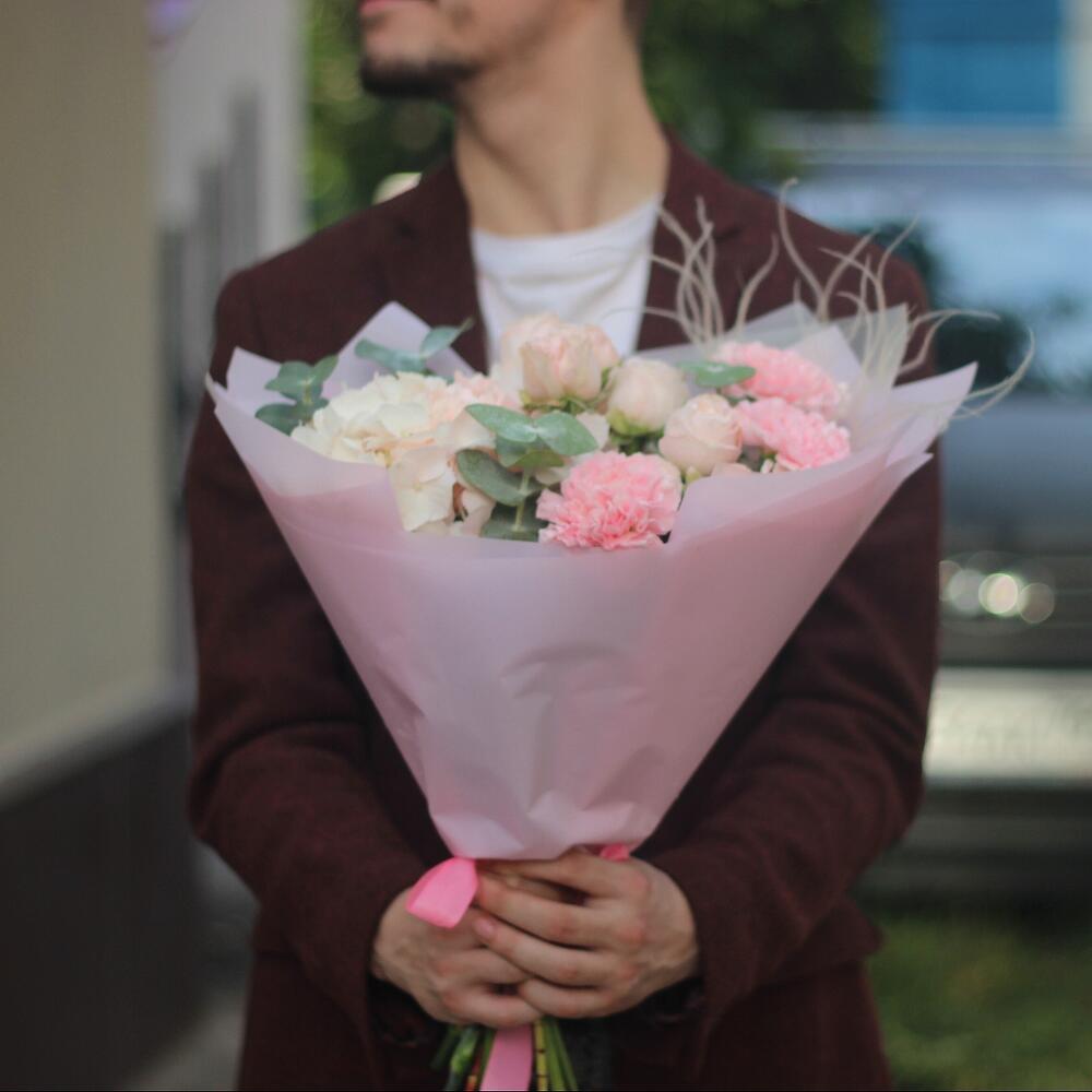 Рускус – 5 шт.Эвкалипт – 4 шт.Лента атласная – 1 шт.Кустовая роза Бомбастик – 2 шт.Гортензия розовая – 1 шт.Диантус розовый – 3 шт.Дизайнерская упаковка – 5 шт.стифа натуральная – 1 шт.