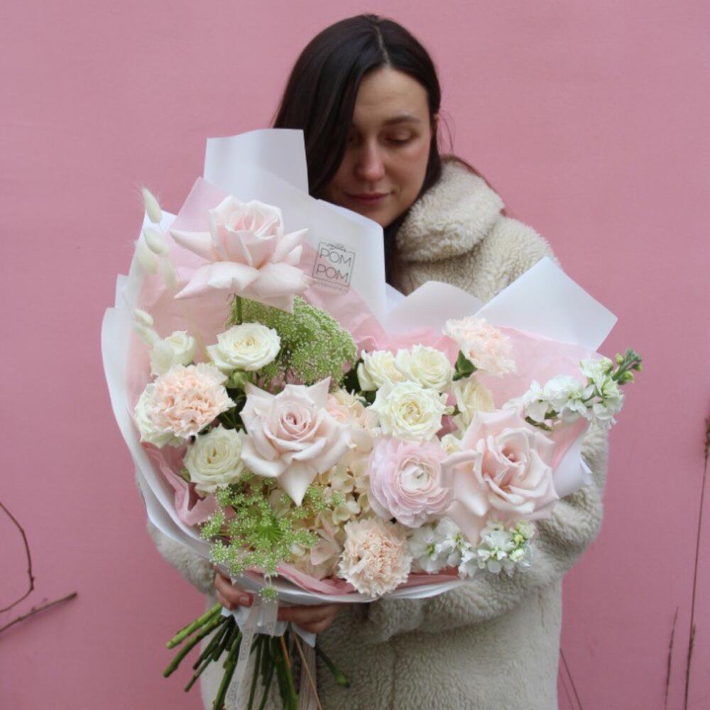 Нежный букет с крупными розовыми пионами и гипсофиллой