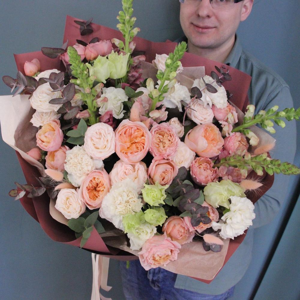 Роза пионовидная кустовая – 4 шт.Роза пионовидная – 3 шт.Львиный зев – 5 шт.Эвкалипт – 5 шт.Диантус – 7 шт.Фисташка – 3 шт.Лизиантус – 4 шт.Тишью – 3 шт.Бумага – 3 шт.Лента атласная – 2 шт.Лагурус – 15 шт.