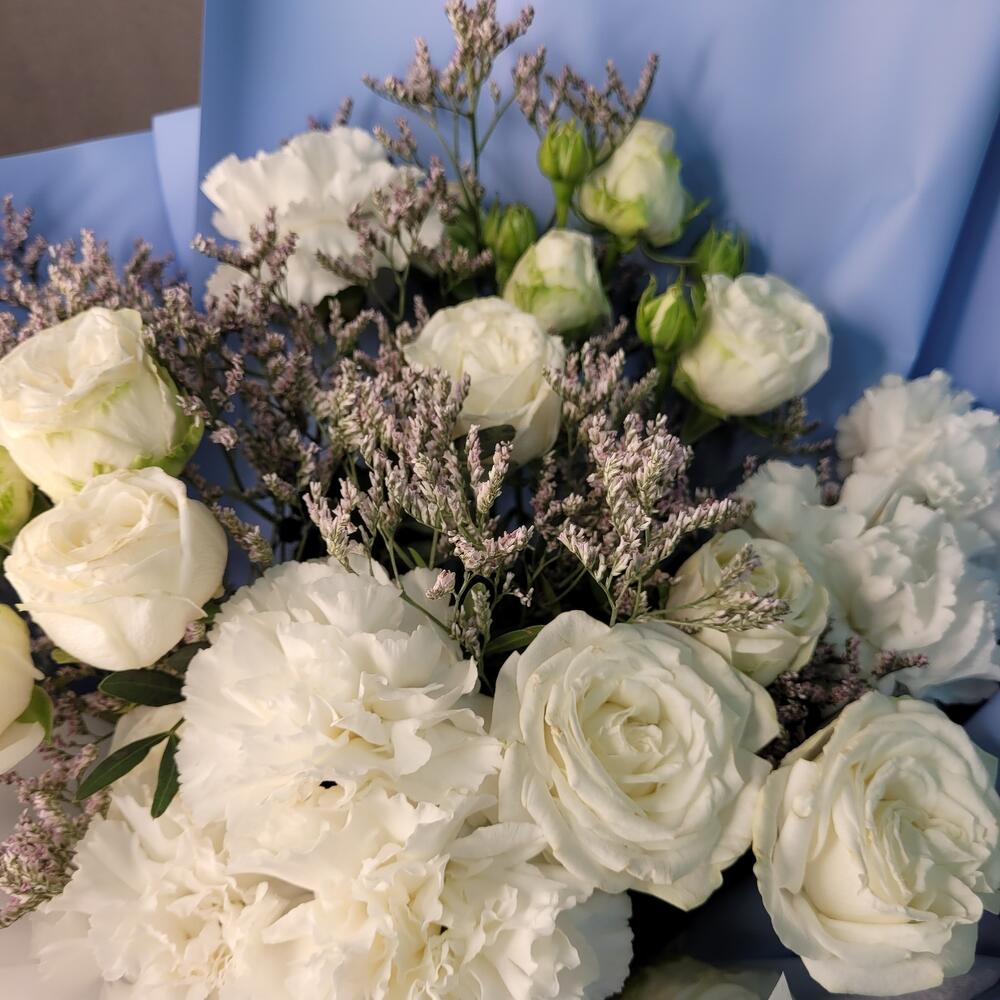 Кустовая роза – 3 шт.Диантус – 6 шт.Лимониум – 2 шт.Фисташка – 2 шт.Упаковка дизайнерская – 1 шт.Лента атласная – 1 шт.