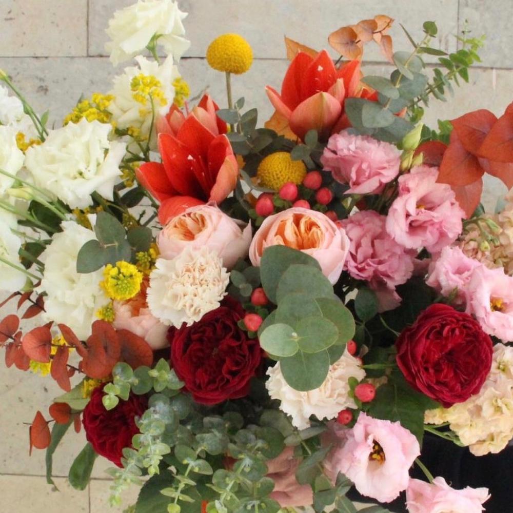 Альстромерии, Гвоздики, Кустовые розы, Лизиантусы, Розы, Хризантемы