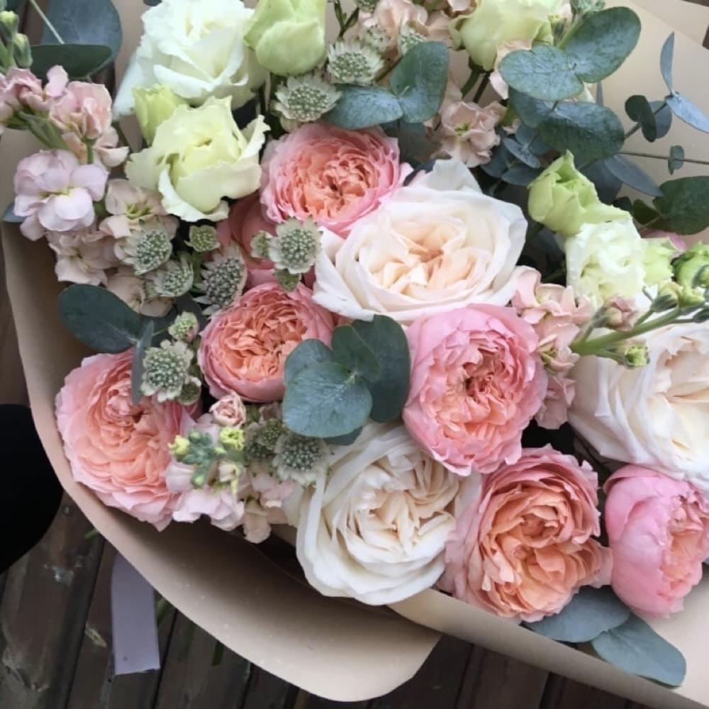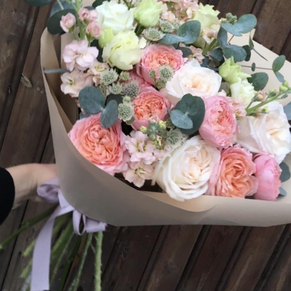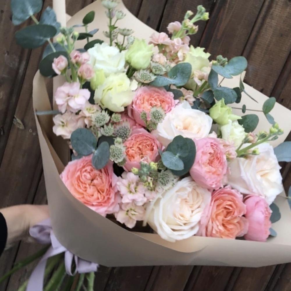 Роза пионовидная – 3 шт.Роза пионовидная кустовая – 3 шт.Маттиола – 5 шт.Лизиантус – 4 шт.Астранция – 3 шт.Эвкалипт – 7 шт.Упаковка дизайнерская – 2 шт.Лента атласная – 1 шт.