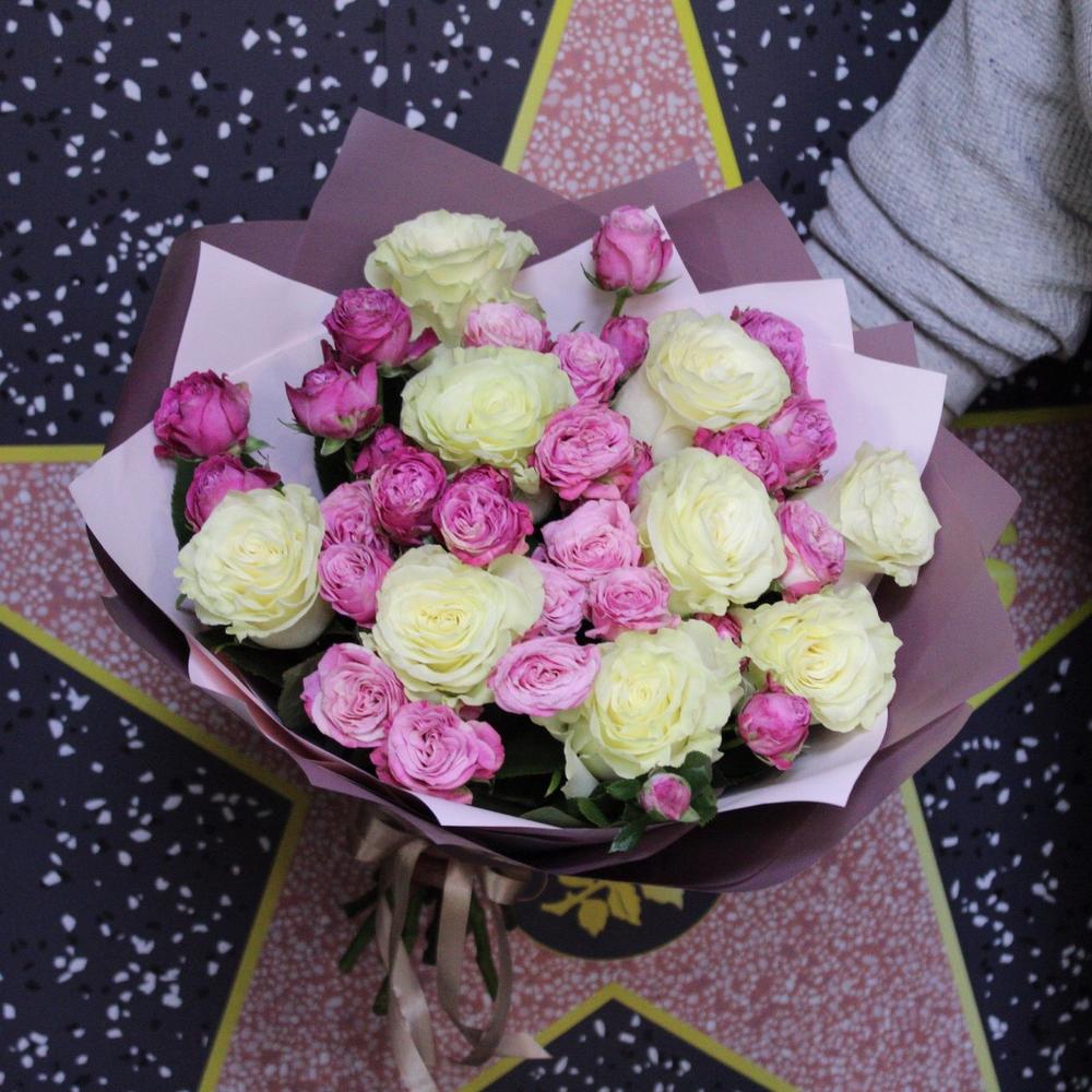 Роза Мондиаль – 9 шт.роза кустовая пионовидная леди бомбастик – 6 шт.Пленка дизайнерская – 5 шт.Лента атласная – 1 шт.