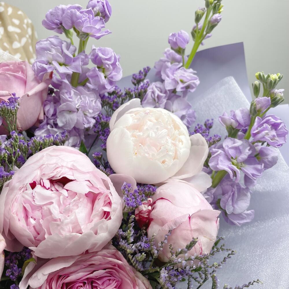 Букет из ароматных цветов – пионы, пионовидные розы, маттиолы