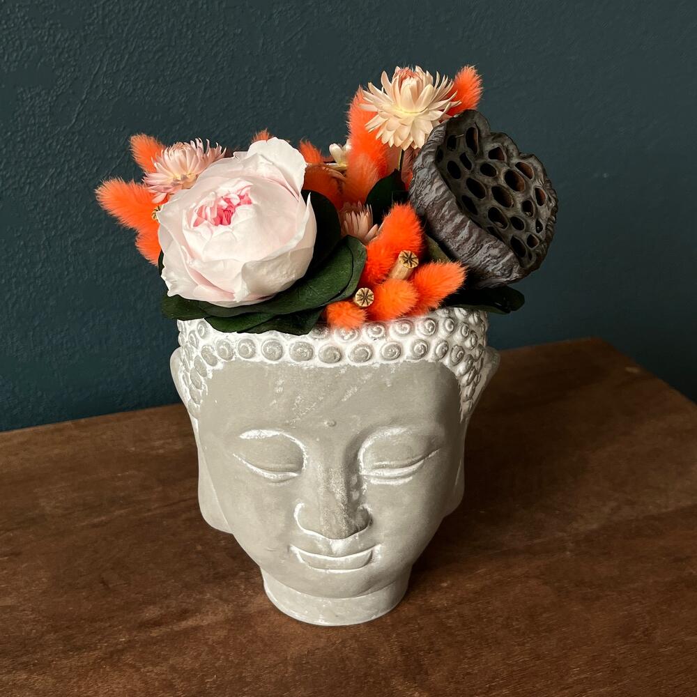 Это не просто букет цветов. А композиция, которая несет в себе философию, что наша жизнь цикличнаПионовидная роза – как распускающийся цветущий лотос А рядом с ней уже сухоцветный лотос, который уже отцвел, но в нем хранятся семена, которые в дальнейшем дадут жизнь новым цветкамЯркий оранжевый лагурус символизирует оранжевое одеяние Будды——————————————————Роза в композиции настоящая, прошедшая специальную обработку стабилизацииБукет из сухоцветов и стабилизированных цветов не завянет, а будет радовать несколько летСухоцветы не требуют трепетного ухода, ведь им не нужна вода, они не притягивают пыль, и сами не осыпаютсяК букету прилагается памятка, как сохранить внешний вид букета на несколько лет