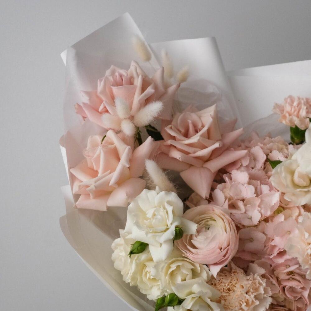 Гортензия – 1 шт.Роза – 6 шт.Упаковка – 1 шт.Гвоздика – 2 шт.Ранункулюс – 1 шт.Лагурус – 1 шт.