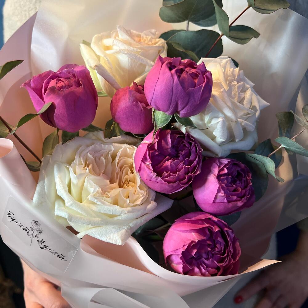 Нежный букет из самых ароматных цветов: премиальная white o’hara, пионовидная яркая кустовая роза и душистый эвкалипт